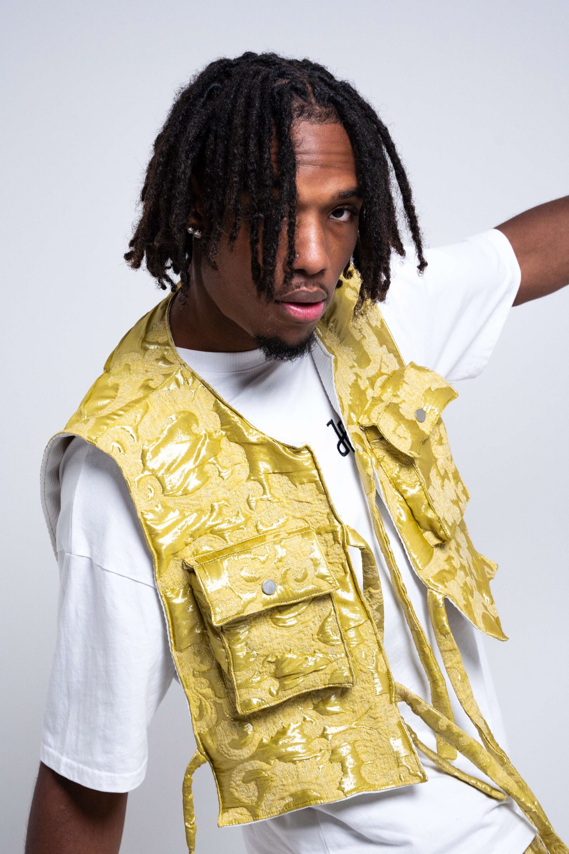 Confectionné dans un jacquard brodé aux motifs organiques, il mêle structure et souplesse. La coupe droite, combinée aux liens réglables à l’avant et sur les côtés, permet d’ajuster la pièce selon chaque morphologie.